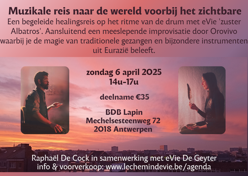 Deze sessie begint met een smudging en vervolgens neemt zuster Albatros je mee op een begeleide healingreis op het ritme van haar drum. Elke reis is uniek en een geschenk van de Spirits voor de aanwezigen in de cirkel. De magische klanken van Raphaël bieden een bedding om de healingreis ten volle te laten integreren.